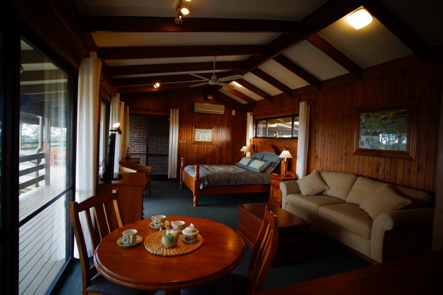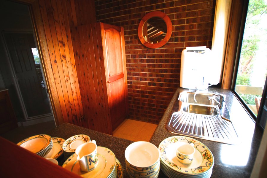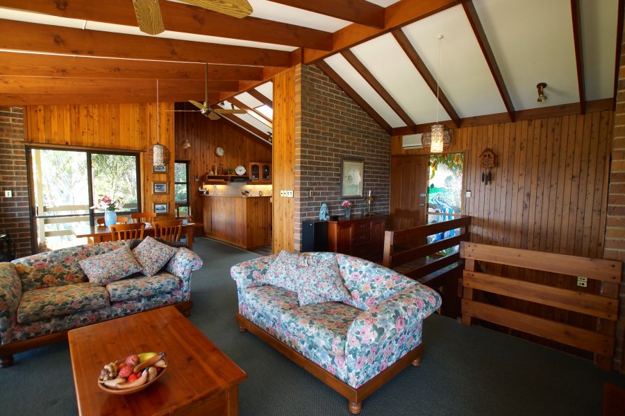 Guest Room, Ensuite & Kitchen - Excellent Bed & Breakfast business potential. 3 panoramic sliding doors & window to deck, Cathedral ceiling with exposed beams, Radiata Pine feature wall, Built in wardrobe, Stereo system closet & book shelf, Split system airconditioner, Ceiling fan, Dimmible ceiling spot lighting, Carpeted floor. Kitchen - Double bowl stainless steel sink, Built in fridge & microwave cupboard, Bench with servery to dining area, Tiled floor. Ensuite - Buit in wall cupboard, Vanity cupboard wash basin, Toilet, Shower, Ceiling lamp space heater, Heated towel rail, Wall mounted hair dryer, Exhaust fan, Tlled floor & walls