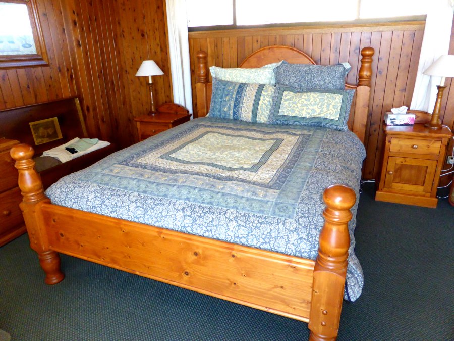 Lounge Main bedroom with Ensuite - Sliding door & window to deck, Cathredal ceilings with exposed beams, Walk in wardrobe & additional built in 4 door wardrobe, Radiata Pine stained feature wall, Ceiling fan, Split system reverse cycle airconditioner,TV wall outlet, Phone outlet, Carpeted bedroom floor. Ensuite - Cathedral ceiling, Marble wall & floor tiles, Full wall mirrored cupboard with light panel, vanity basin, toilet, shower, exhaust fan & wall mounted heater.