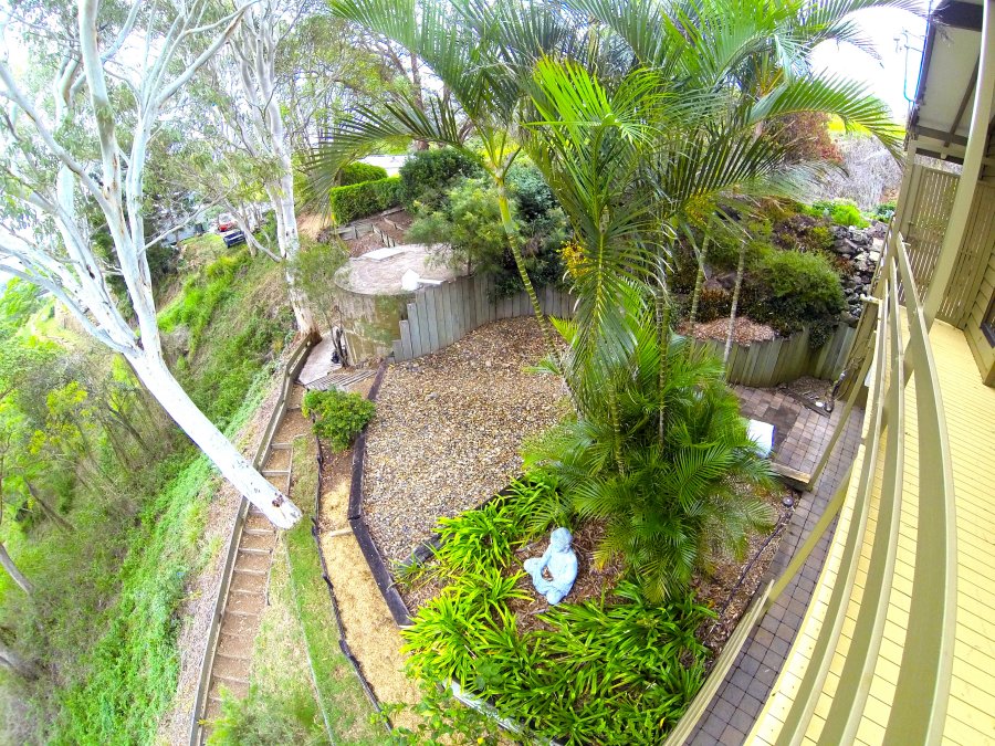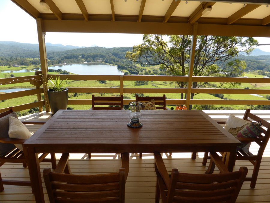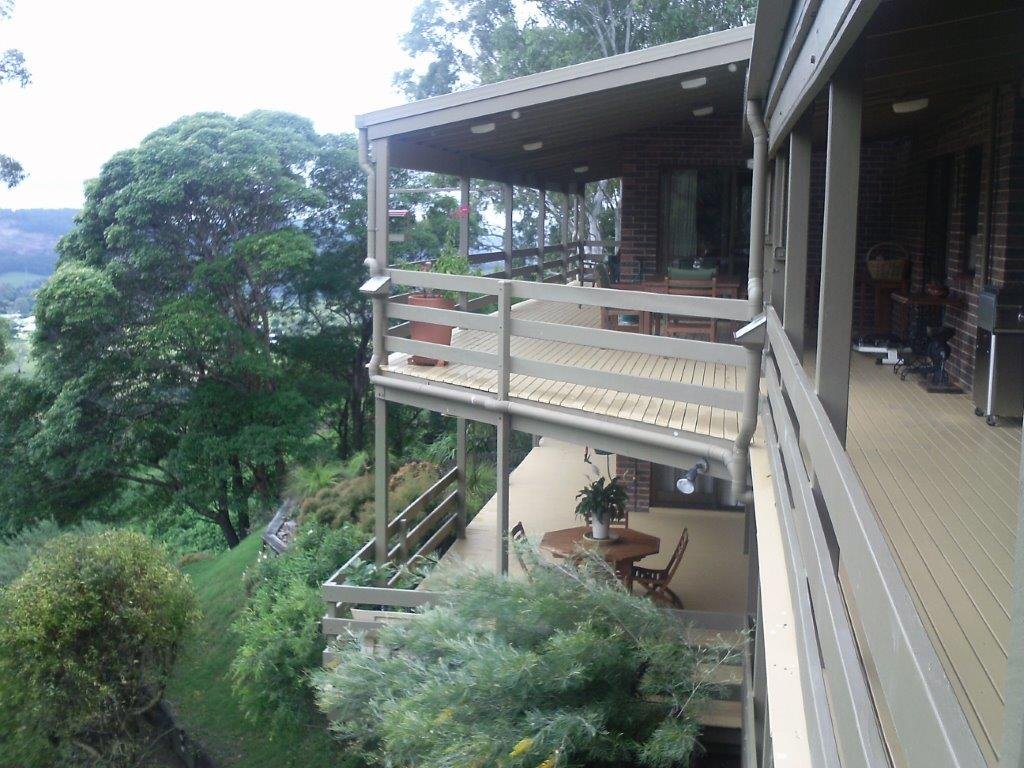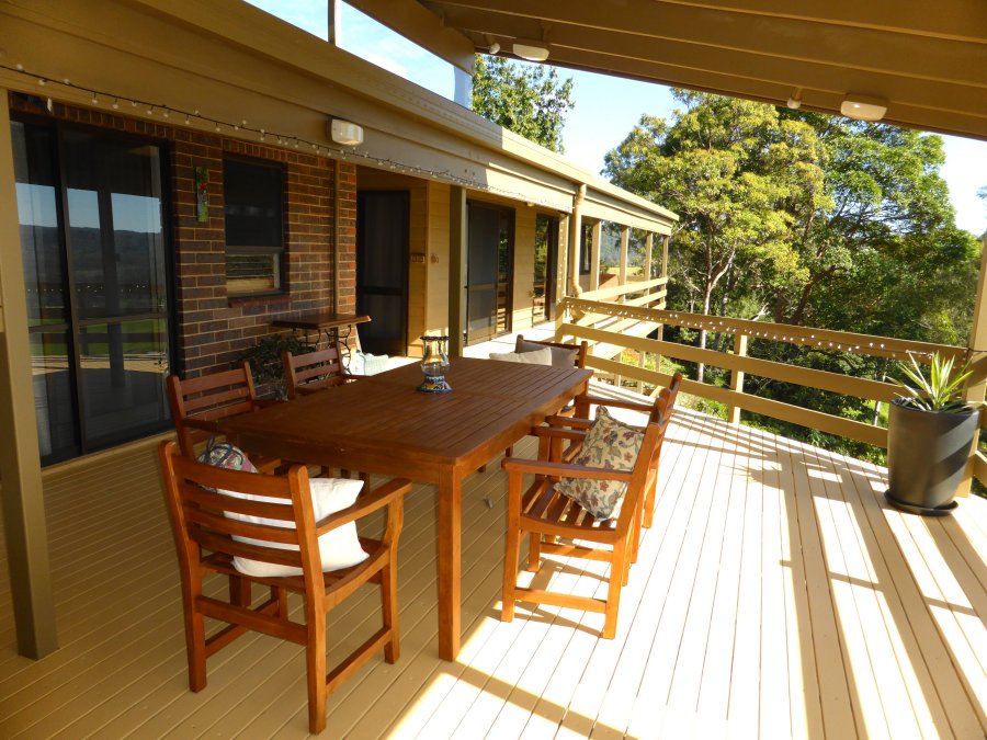 Lower deck Panoramic views, Covered 100sqm, Timber & pavers flooring, Spa area & spa power outlet, Clothes line, 4 wall mounted storage cupboards, additional cupboard for the kitchen water filtration system also cupboard for gardening tools & chemicals. Vegetable garden watering system timer, 2 Water taps & hose reels, Access to garage driveway, #2, #3 & #4 bedrooms, Laundry, Workshop, Garage & Gardens. Steps to under garage water tank storage area,