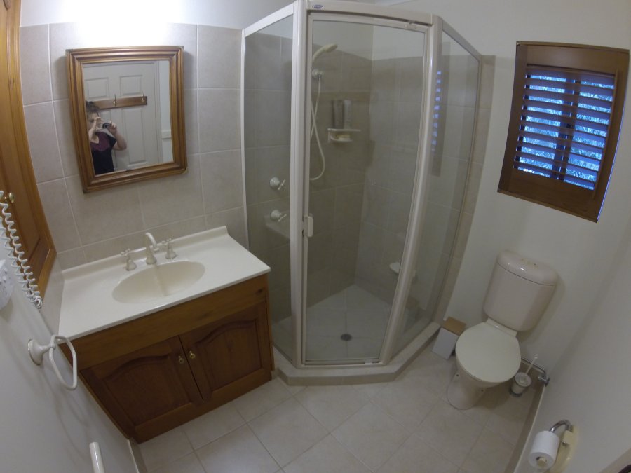 Bathroom - Lower level with sliding window, Full bath with glass shower screen, Basin on 2 door vanity with 3 draws, Toilet suite, Externally exhausted fan, Wall & floor lighting, Tiled floor & walls.. Bathroom