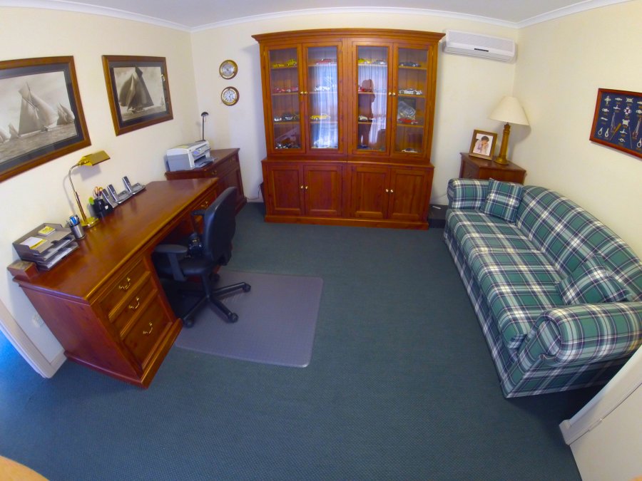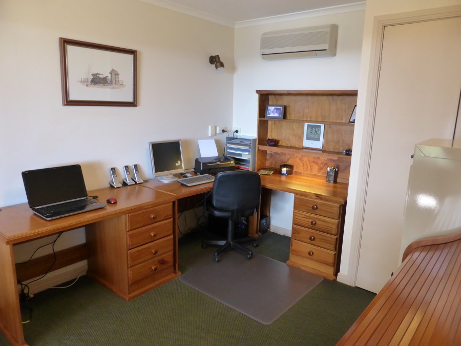 Bedroom 4 or office/craft room - Lower level with sliding door to deck, Built in cupboard, Built in desk, Split system reverse cycle airconditioner, Wall & ceiling lights, TV outlet, Phone outlet, Carpeted floor.. Deck