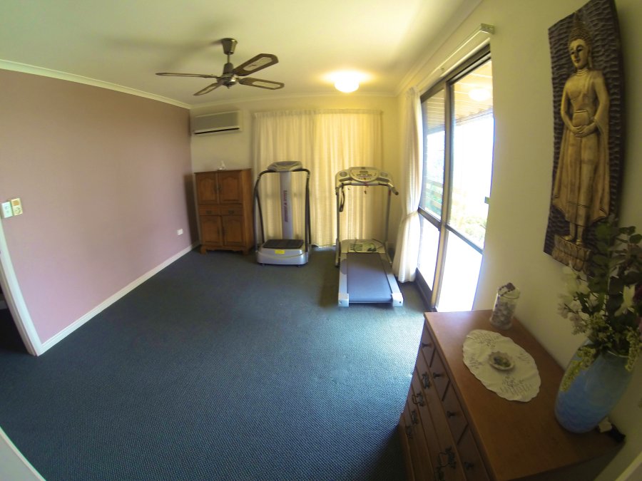 Workshop/storeroom - 4m x 4m, Lattace covered steel framed fixed wall & entry door for ventilation of 4 air conditioning units, Solar 150 litre hot water storage tank. Shelf racks, Gate to behind house wall services passage, Multiple power outlets, Overhead fluorescent tube lighting, Garage water tank first flush dirt diverter, Concrete floor.