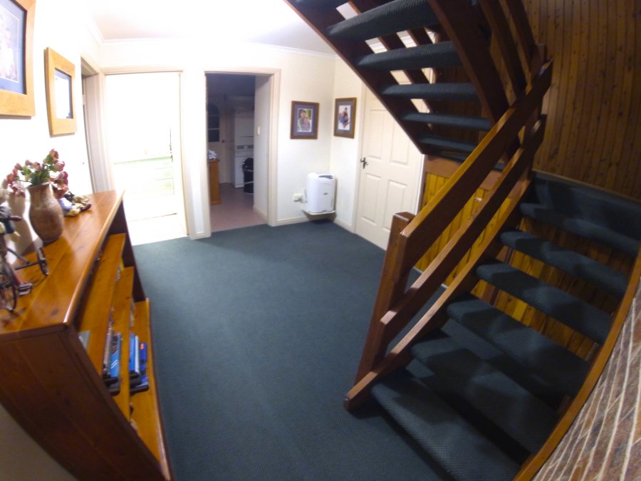 Lounge/dining room - Panoramic sliding doors to the deck entertainment area, Cathedral ceiling with exposed beams, Split system reverse cycle airconditioner, Wood fueled "Spin-a-Fire", 2 Ceiling fans, In wall stereo system closet, Dimmible ceiling spot lighting, TV outlets for free to air & Foxtel, Stairwell to lower level, Radiata Pine stained panelling, Carpeted floor & stair treds.